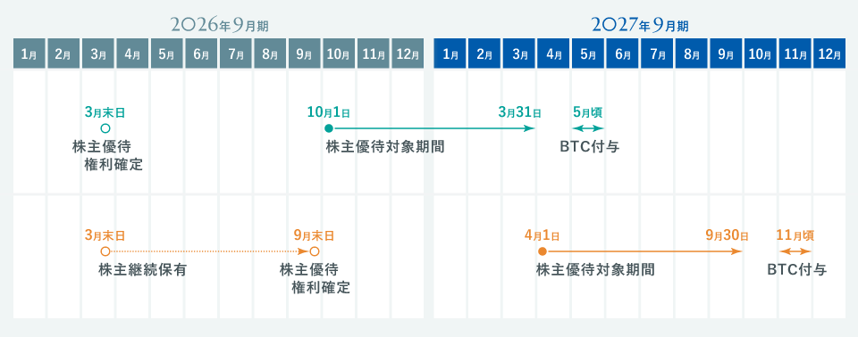 | 付与時期 | 3月末時点の株主様の対象期間は、翌年5月頃 9月末時点の株主様の対象期間は、翌年11月頃 |